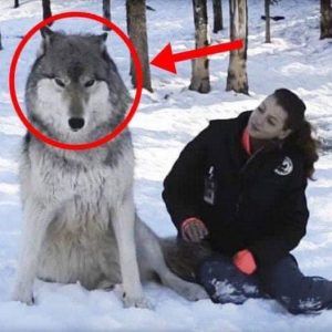 Watch as the giant wolf settles down next to the woman and their eyes finally lock