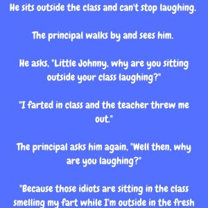 Little Johnny farts in the classroom and his teacher gets really upset and throws him out. He sits outside the class and can’t stop laughing. The principal…