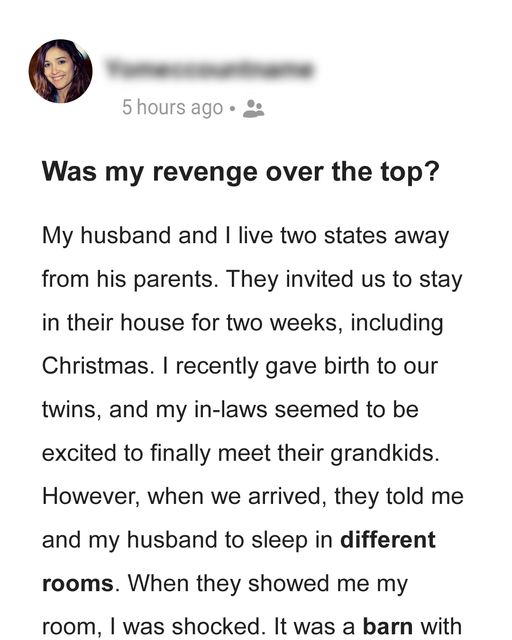 Evelyn, excited to introduce her twins to in-laws for Christmas, found herself facing an unexpected nightmare. Instead of the warm family reunion she anticipated, she and her husband were told to sleep separately in cramped, uncomfortable spaces — Mike in his childhood bedroom and Evelyn in a barn. Confused and upset, she confronted Mike, who dismissed her concerns. As her in-laws insisted on separate sleeping arrangements for the family, including the twins, Evelyn reached her breaking point.
