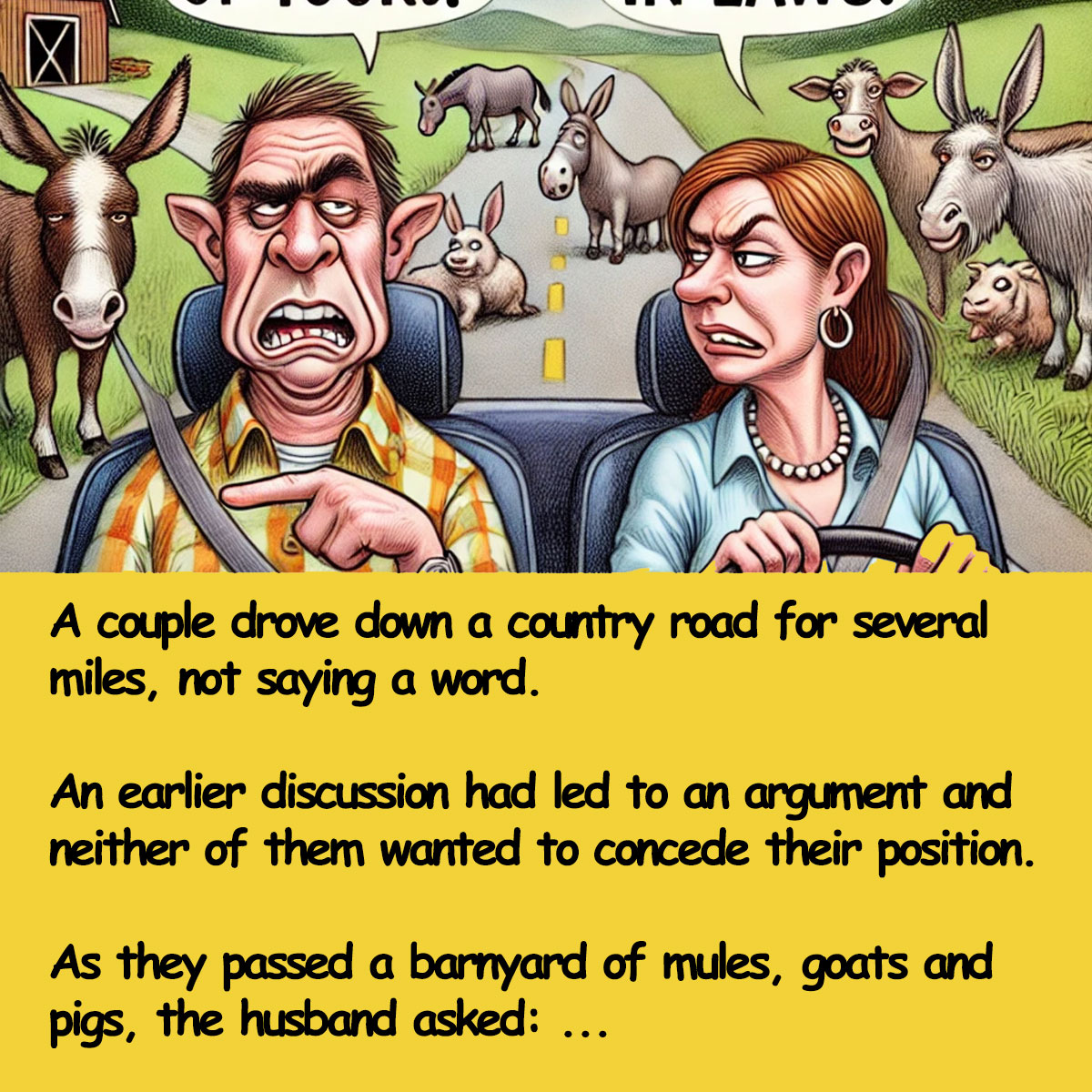 As they passed a barnyard of mules, goats, and pigs, the husband asked sarcastically: